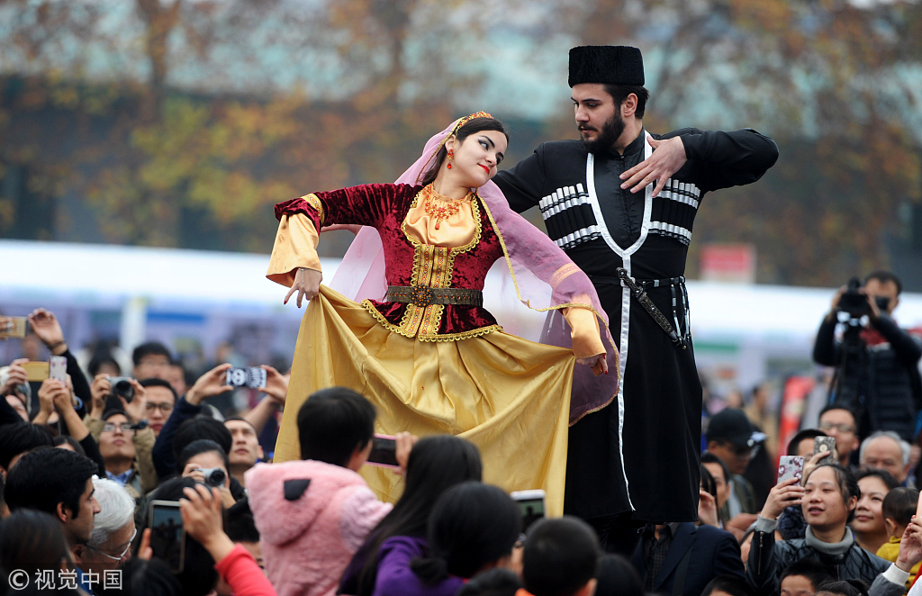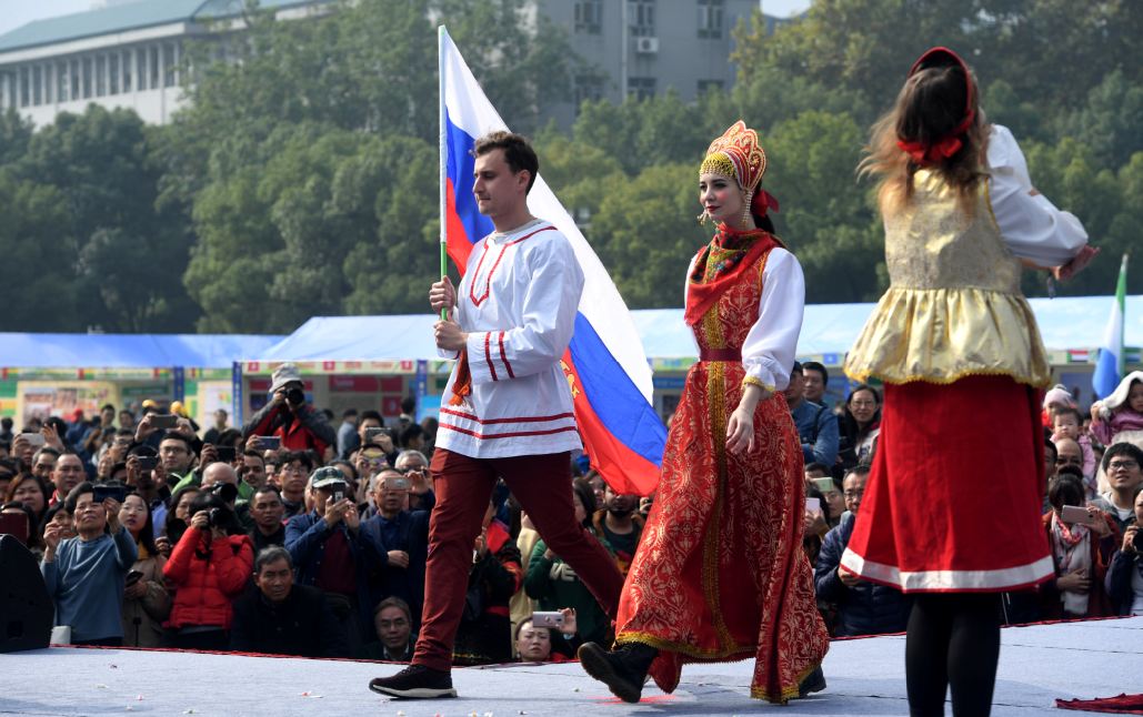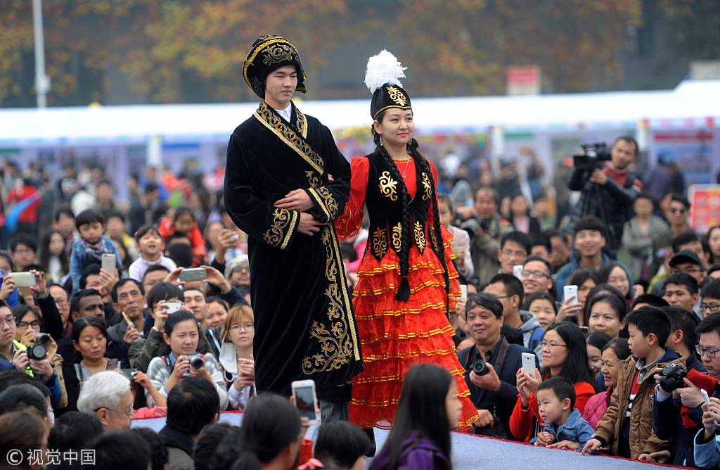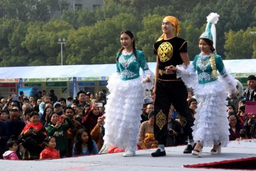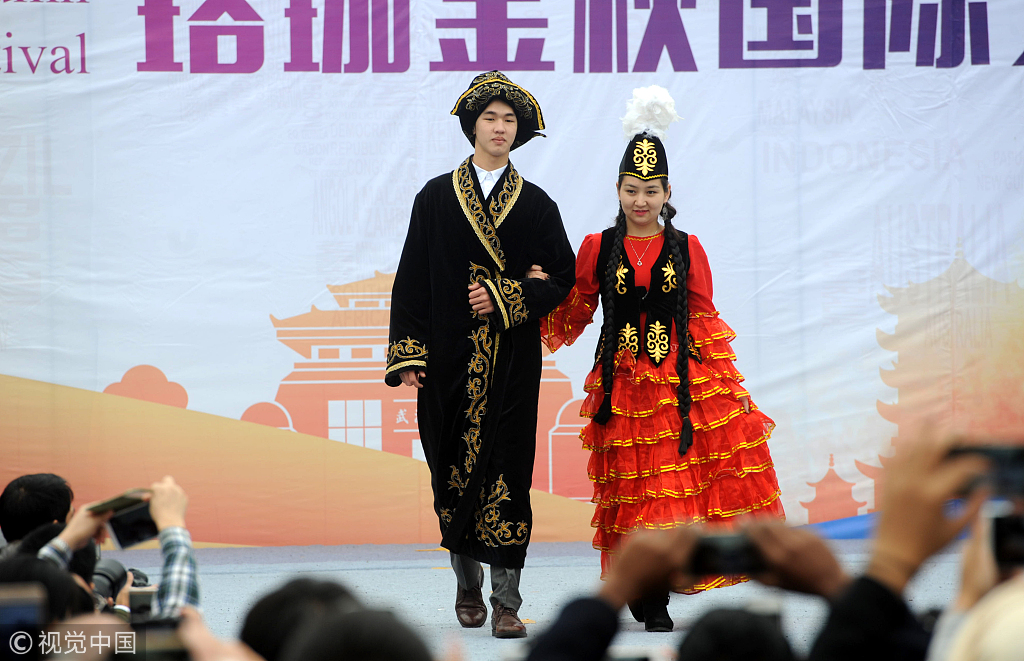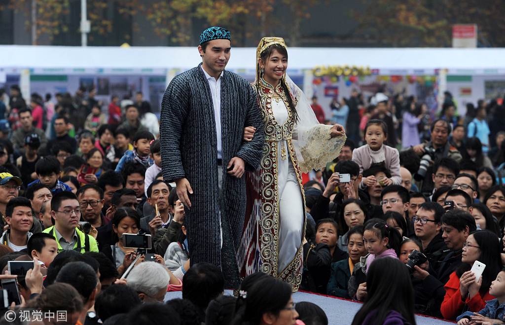 Students from Kazakhstan model traditional clothing during an international cultural festival at Wuhan University, Hubei province, on Sunday. The event drew students from more than 80 countries who celebrated their culture with their Chinese classmates. [Photo by Li Ziyun/For China Daily]