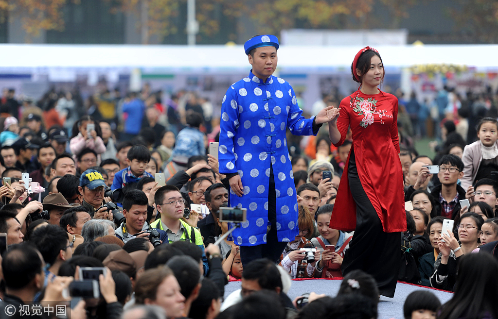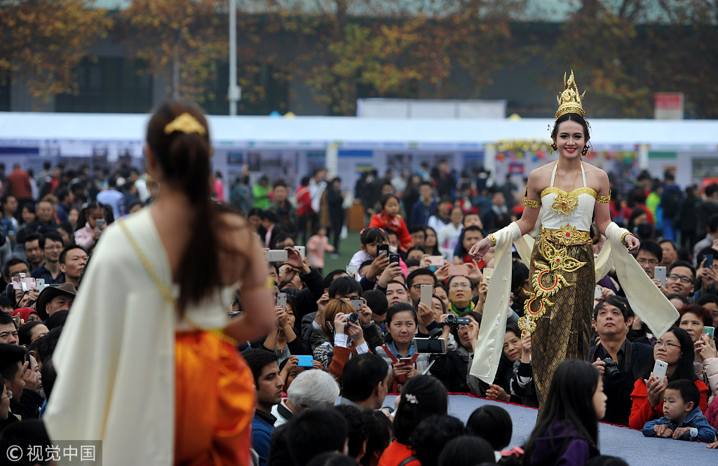Students model traditional clothing during an international cultural festival at Wuhan University, Hubei province, on Sunday. The event drew students from more than 80 countries who celebrated their culture with their Chinese classmates.