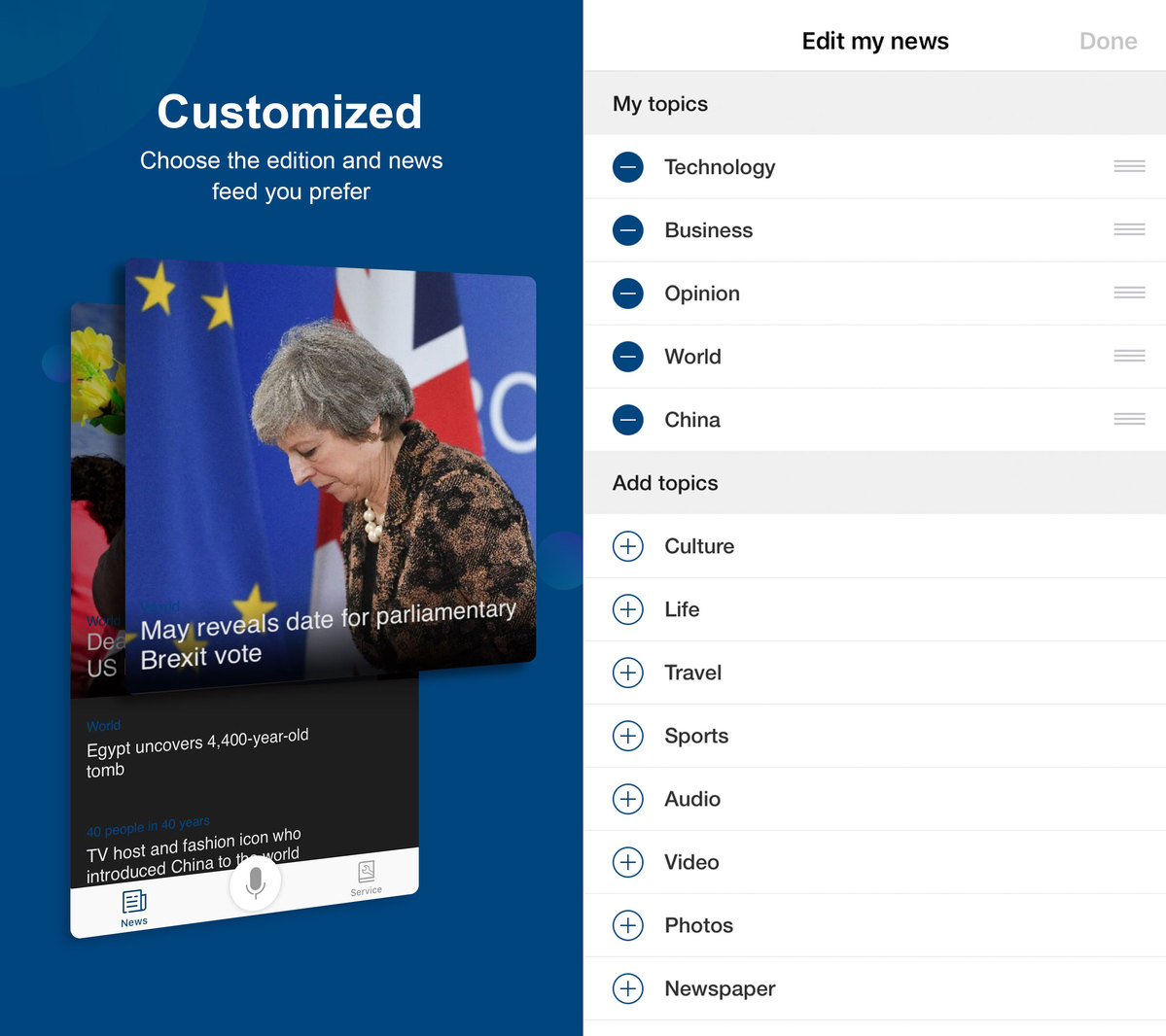 用户可以在Personal Center(个人中心)自行切换中国版和国际版,在My News里,可以通过订阅话题的方式,进一步为自己定制个性化的新闻流。