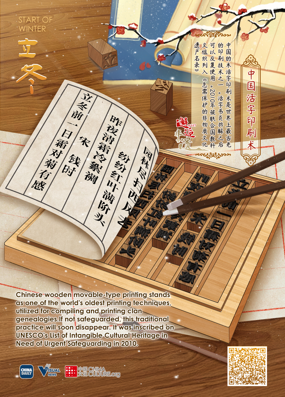 The traditional Chinese solar calendar divides the year into 24 solar terms. Start of Winter, (Chinese: 立冬), the 19th solar term of the year, begins this year on Nov 7 and ends on Nov 21.